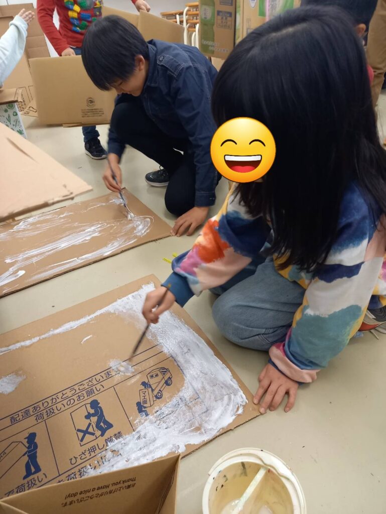 さて、工作では災害時でも比較的手に入りやすい段ボール箱をつかって、机づくりに挑戦しました。